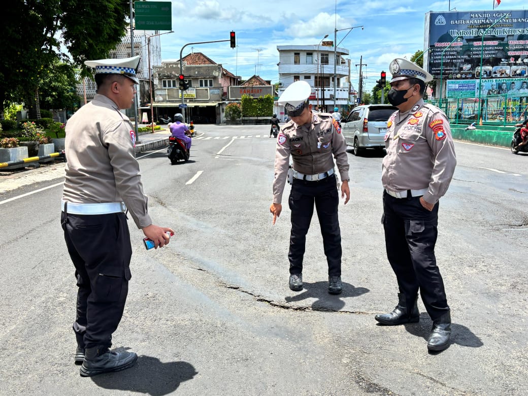Banyuwangi Suryamediagrup.com Menyikapi banyaknya keluhan masyarakat soal jalan berlubang di depan Masjid Agung Baiturrahman Banyuwangi, Satlantas Polresta Banyuwangi bergerak cepat dengan melakukan patroli jalan berlubang, Kamis (06/11/2025).