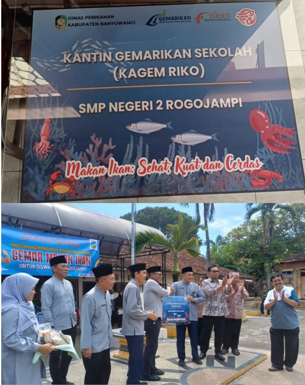 Kegiatan kampanye GEMARIKAN (Gerakan Memasyarakatkan Makan Ikan) sekaligus sosialisasi GO IKAN (Gerai Olahan Ikan Banyuwangi) dalam rangka pelaksanaan program Kagem Riko digelar di SMPN 2 Rogojampi, Jumat (7/11/2025). Acara ini turut dihadiri oleh Asisten Perekonomian dan Pembangunan Sekretariat Daerah Banyuwangi, Dwiyanto, Kabid Pengolahan dan Pemasaran Hasil Perikanan (P2HP) Dinas Perikanan, Irfan, serta Kepala Bidang Pendidikan SD Dispendik Banyuwangi, Sutikno, dan perwakilan Dinas Kesehatan Banyuwangi.