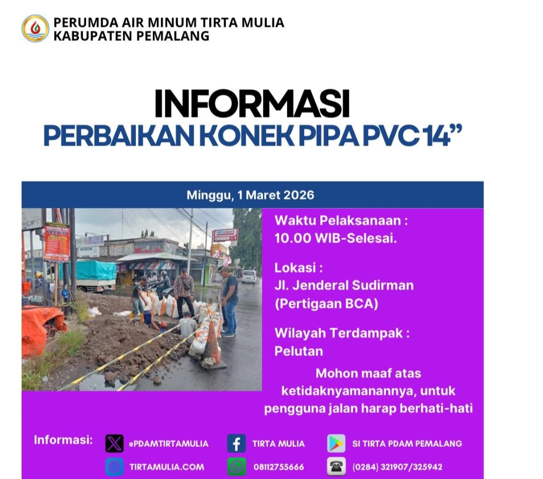 Sementara itu, bagi pelanggan yang membutuhkan informasi lebih lanjut atau ingin melaporkan kendala distribusi air setelah perbaikan, Perumda Tirta Mulia menyediakan layanan pengaduan melalui WhatsApp di nomor 0811-2755-666. Layanan juga dapat diakses melalui aplikasi SI TIRTA PDAM Pemalang.