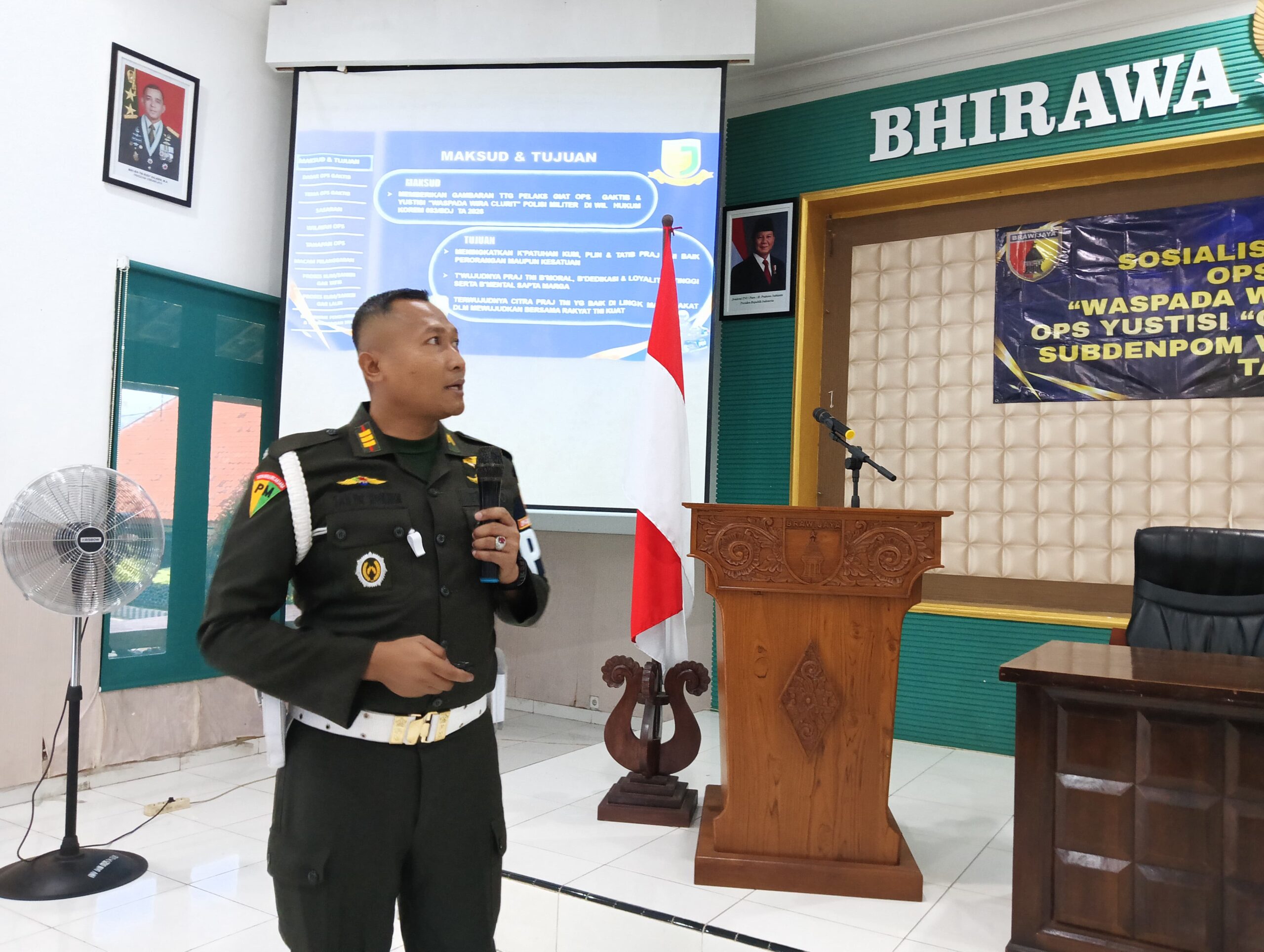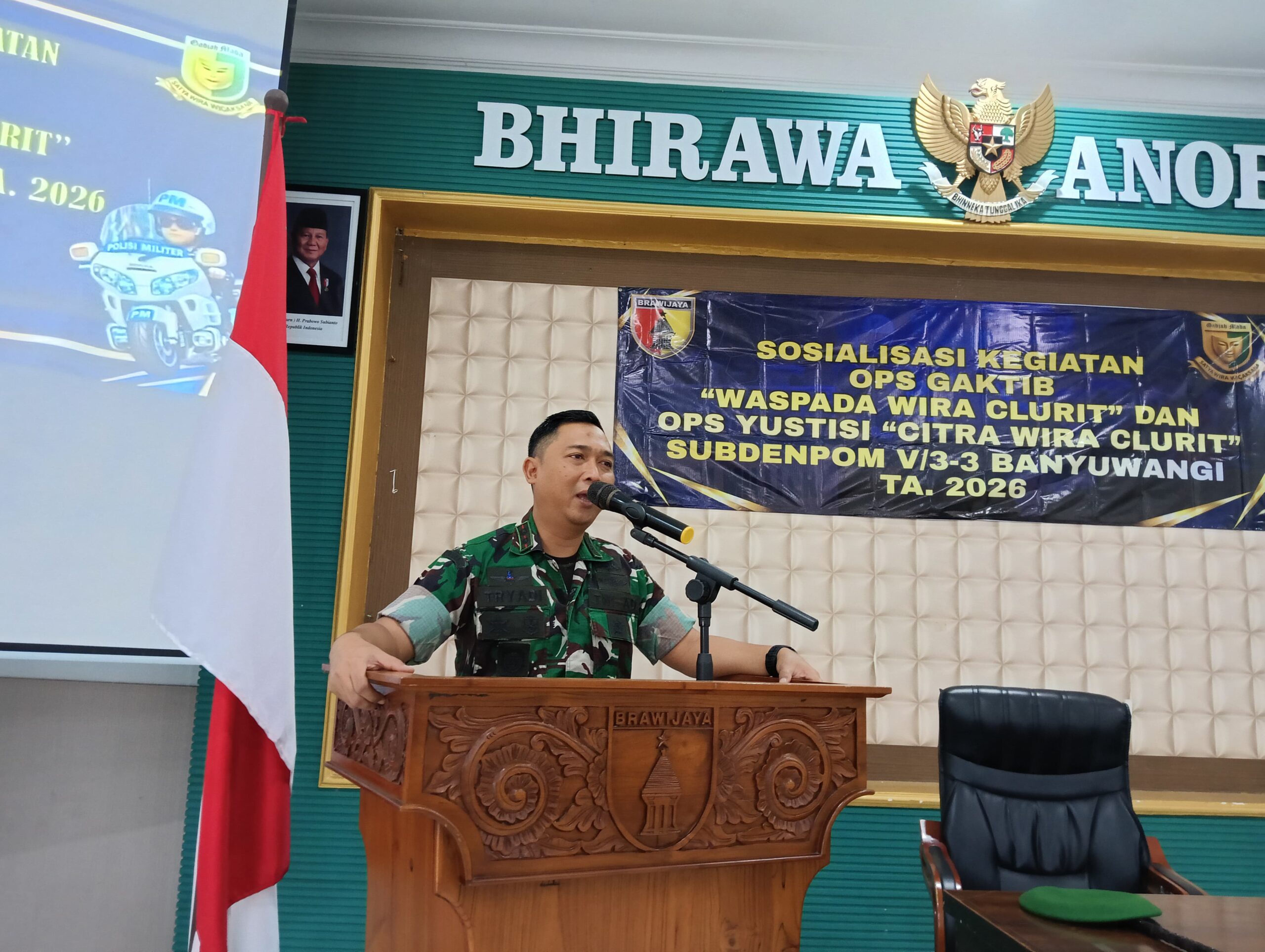 Banyuwangi, Jatim Suryamediagrup.com Upaya memperkuat disiplin dan ketertiban prajurit terus digencarkan melalui Sosialisasi Operasi Penegakan Ketertiban Waspada Wira Clurit dan Operasi Yustisi Citra Wira Clurit Subdenpom V/3 Banyuwangi Tahun Anggaran 2026. Kegiatan tersebut digelar pada Senin (23/2/2026) di Aula Panglima Sudirman Makodim 0825/Banyuwangi, Jalan RA Kartini Nomor 02, Kepatihan, Kabupaten Banyuwangi. Sosialisasi ini bertujuan memberikan pemahaman menyeluruh terkait pentingnya kepatuhan hukum, disiplin militer, serta menjaga citra TNI di tengah masyarakat.