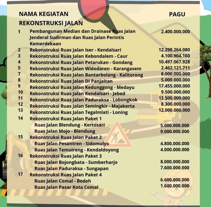 Dalam laporan tersebut, sejumlah proyek rekonstruksi jalan mendapat alokasi anggaran signifikan dan menjadi prioritas karena perannya sebagai urat nadi perekonomian warga, di antaranya: